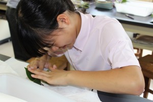 中学1年生は「蒸散」について学びました。“葉の裏に多くある気孔から蒸散が盛んにおこなわれると、吸水も多くなる。”という結論に向かいたかったのですが、なんとビニールチューブと枝の大きさがうまく合わず、水が漏れる生徒が多発し、結局失敗に終わりました。それでも時間ギリギリまであきらめず枝をはめようとする生徒を見て、ちゃんと予備実験してなくてごめんね。と思い反省しました。