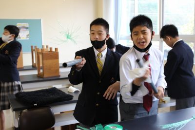 2学期最後の授業です。今年は晴れが続きますね。とても空気が乾燥しています。そんな日はこの「電気クラゲ」の実験をやりましょう。エアコンを効かせ、さらに実験室を乾燥させると、パチパチ、パチパチ、静電気が起こりやすい状態になります。みんな1日7時間の授業、そして部活動をよくがんばりました。ちょっとしたご褒美です。面白実験でした。