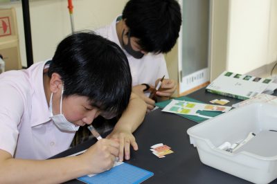 今年もやってまいりました、DNAの二重らせん構造のペーパークラフト作成です。例年、1時間で終わらせようとするとグダグダになりますので、思い切って2時間を確保し、完成を目指しました。1時間目「パーツの切り抜き」、2時間目「組み立て」として、みんなでワイワイ作りました。早く完成した生徒は遅い生徒を手伝っていました。優しいなぁ。