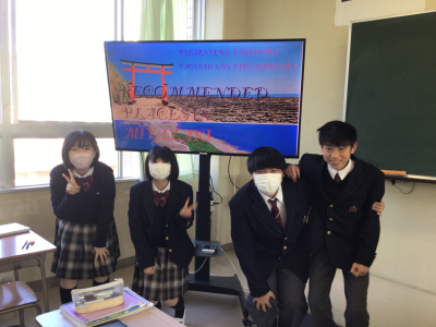 中学2年1組で自分の住む地区の魅力を英語で伝えるという発表をしました。