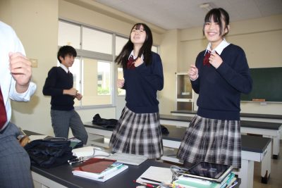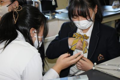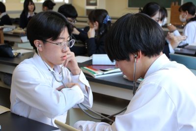 中学3年生は「自律神経」について学びました。興奮時に多くの身体機能を高めるために働く交感神経と、安静時に落ち着かせる副交感神経です。まずは聴診器で心音を確認し、安静時と運動後の心拍数の変化を観察しました。運動は音楽をかけて踏み台昇降をします。今年も「シンデレラガール」と「大阪LOVER」をかけることができました。