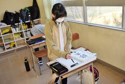 中学2年生は「新たな目標」「大志を抱く」から中学3年生は「旅立ちの春」「伝統を守る」からそれどれ一つを選択し、書きました。