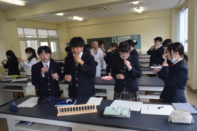 中学3年生 試験管で楽器を作ってみよう 2025年02月18日 News気柱の固有振動の教材で試験管を用いての楽器、試験笛を作ってみました。音階のそれぞれの振動数から気柱の長さを計算し、8本の試験管でドレミファソラシドの楽器を作り、楽しく各班で演奏ができました。