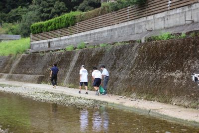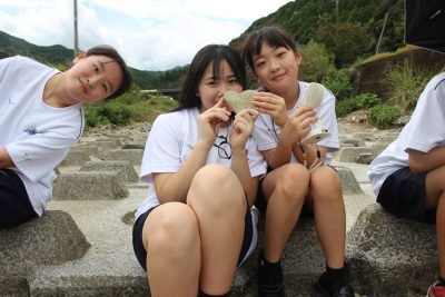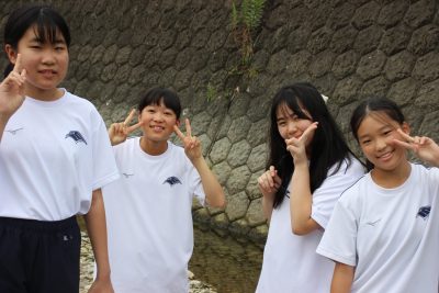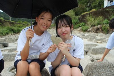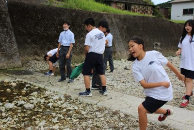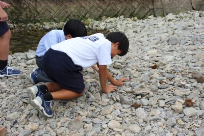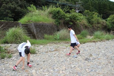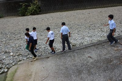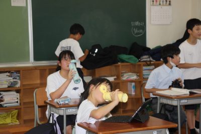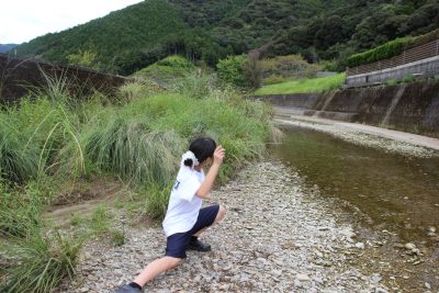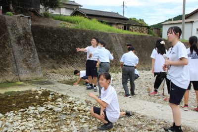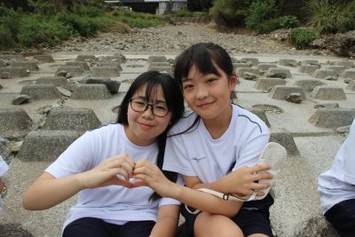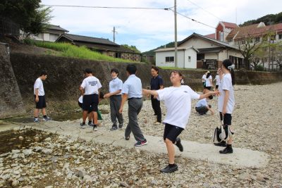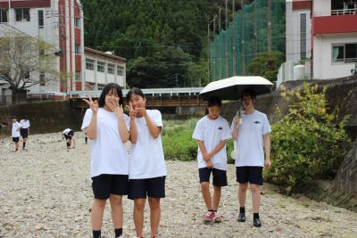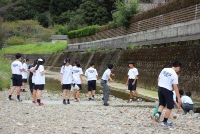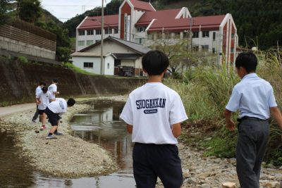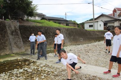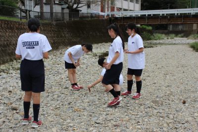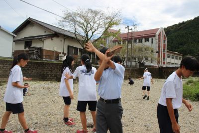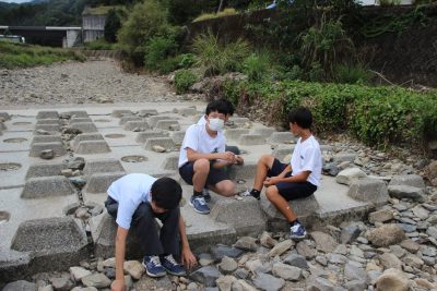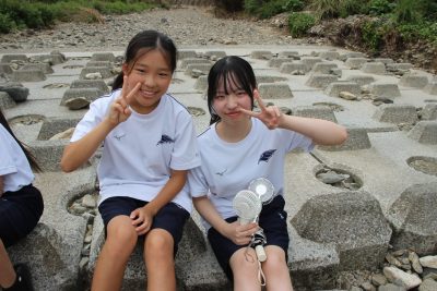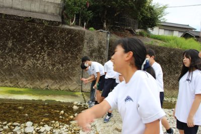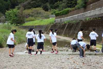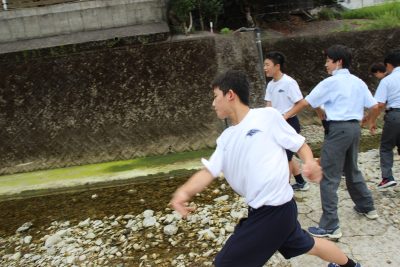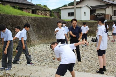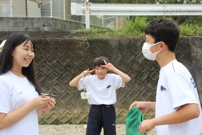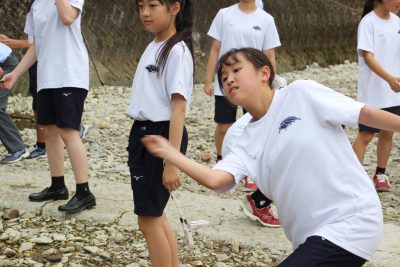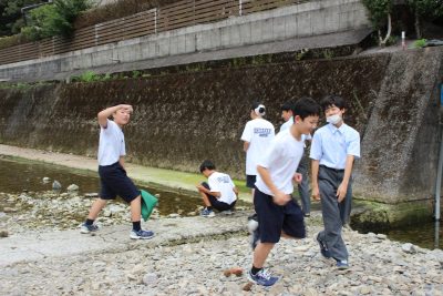 中学1年生は「岩石」について学んでいます。それでは実際に見に行きましょうと、すぐそばの河原に石を採取に行きました。しかし、「川」と「石」があれば絶対に投げたくなります。案の定「水切り大会」が始まりました。周辺に注意してジャボンジャボン投げました。なんと私、顕微鏡の神様でありながら、水切りの神様でもあります。ちょっと見ときなさいと本気で石を水面に滑らせましたところ、生徒たちがドン引きしていました。恥ずかしい、大人げない…。楽しい観察でした。
