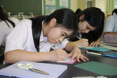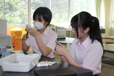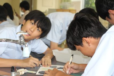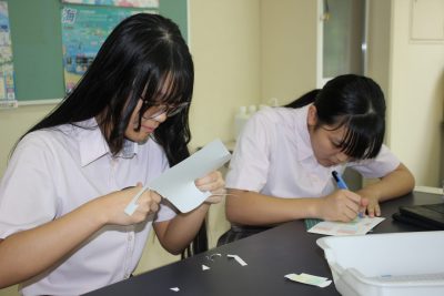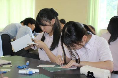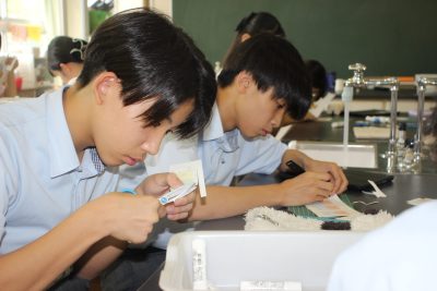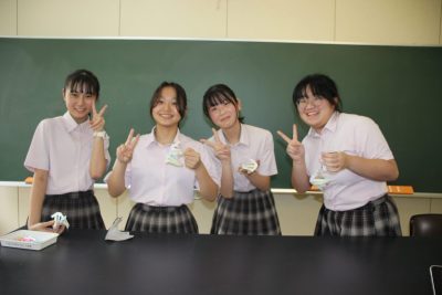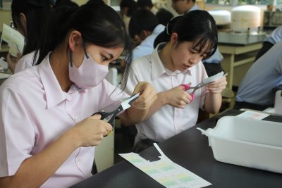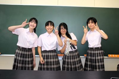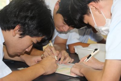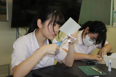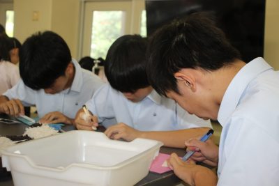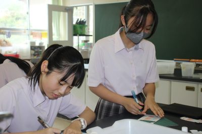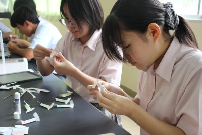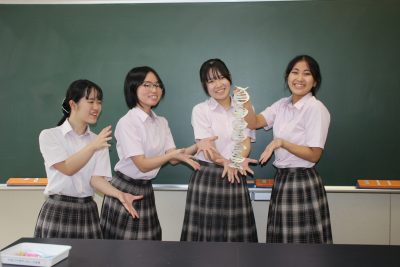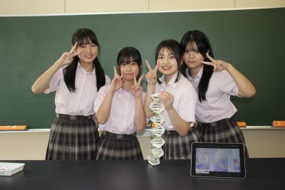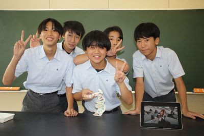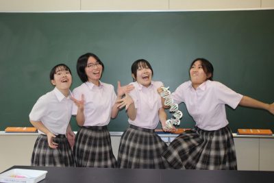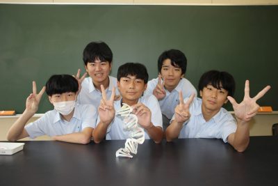 中学3年生はDNAについて学びました。私たちが持つ遺伝物質であるDNAは美しい二重らせん構造をしています。ちょうどいいペーパークラフトがありましたので、作成しました。いつもは個人戦ですが、今回は班で長くつなげる団体戦で行いましたところ、3年生は他を思いやる気持ちが強いのでしょうか、がぜんやる気になり、大変早く完成しました。そしていつもの記念撮影です。