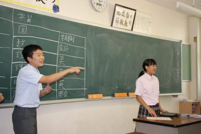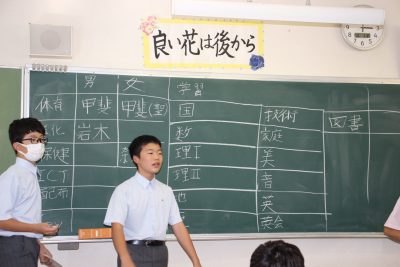 中学1年生のある日のLHRの様子です。2組は係決めを行いました。まず委員長が競合し、投票で決まりました。副委員長以降はジャンケンで決めます。なぜ係決めってこんなに盛り上がるのでしょうか。ただのジャンケンなのになぜあのような大きな物音がするのでしょうか。よほどその係になりたかったのでしょうね。(4月の保護者の役員決めもこうあって欲しいです。冗談です)ドッタンバッタンやっている隣で1組は文化祭の劇の反省会(良い所を挙げて来年につなげるため)を真面目にやっていました。