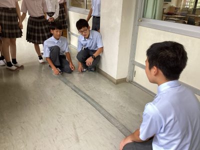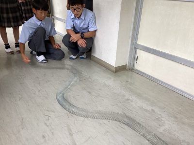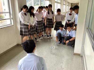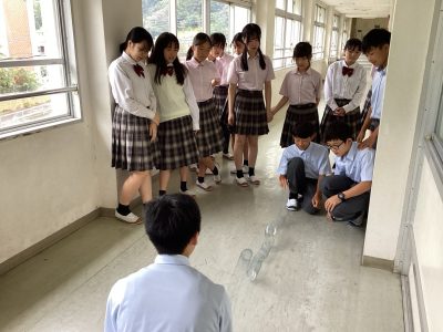 中学1年生は地学分野の「地震」について学んでいます。初期微動を引き起こすP波と、主要動を引き起こすS波について、ばねを使って実際に伝わる速さを体感してもらいました。しかし、中学1年生にばねを持たせると危険です。理科室にあったボロボロなばね(きっと私より早く生まれている)がブンブン振り回されました。あわわ、と思いながら、でも興味があるのね、と止めるのを我慢しました。