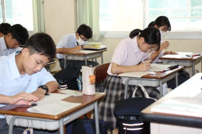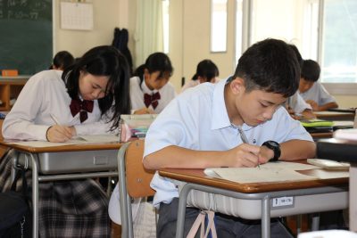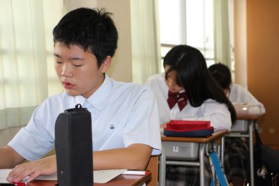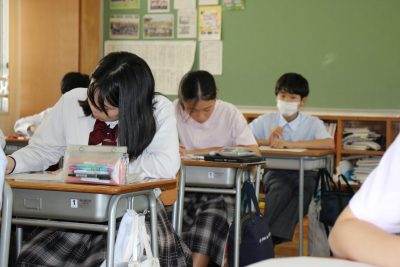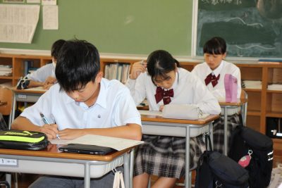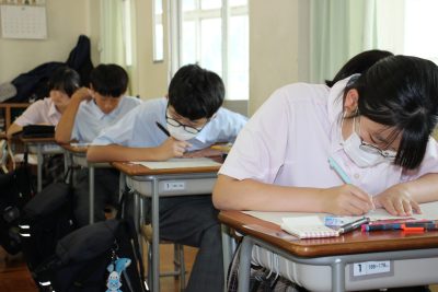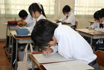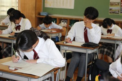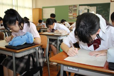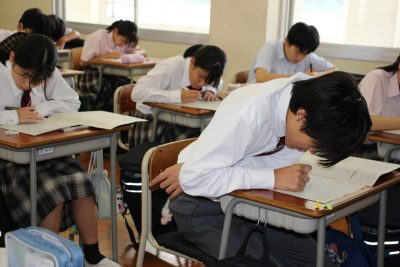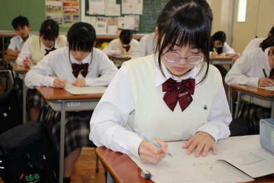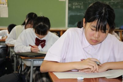 先日のLHRで10/22に受験する中学校総合学力調査(ベネッセ)の過去問演習をしました。1年生にとっては初めて受験する校外模試です。国英数の3科目に加えて「融合問題」という教科を超えた教科があり、この問題を解きました。「日本と外国のことわざについて」「野菜の歴史と甘いトマトの選び方」という面白い問題でした。解説をしますと、記述の解答について「これで何点もらえますか」と積極的に見せに来る生徒が多数おり、素晴らしいと思いました。