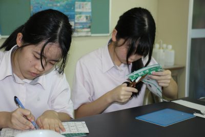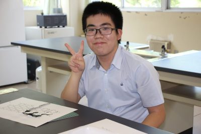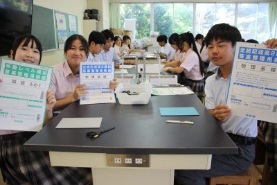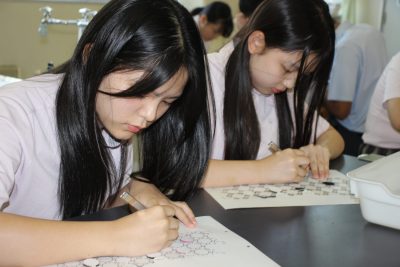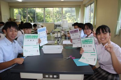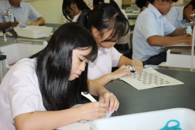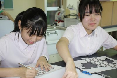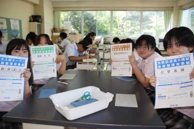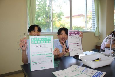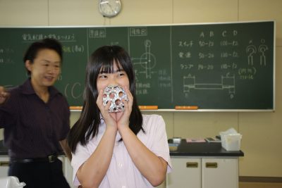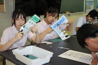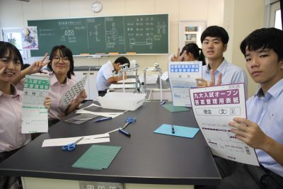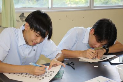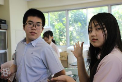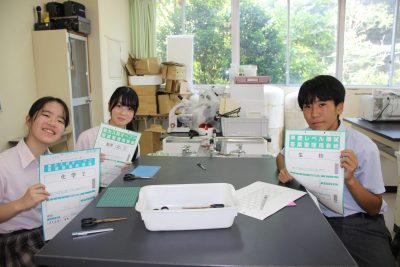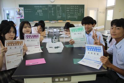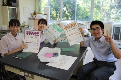 少し前の実験ですが、炭素化合物であるフラーレン(C60)の分子模型の作製をしました。用紙を切り抜いて組み立てますと、美しいサッカーボール状になります。完成すると達成感があり、楽しいペーパークラフトです。いつもの早く終わった人たちによる記念撮影もあります。