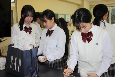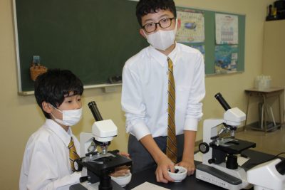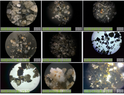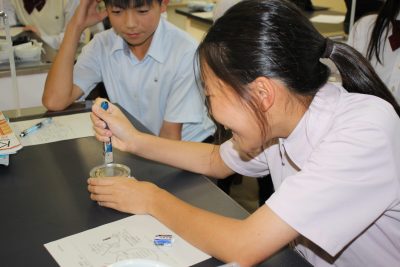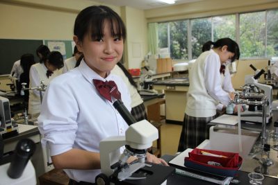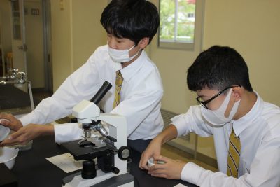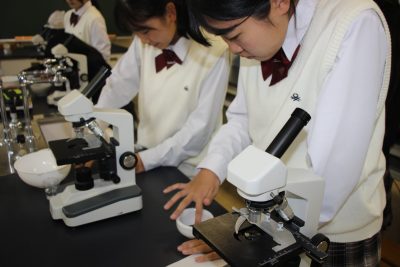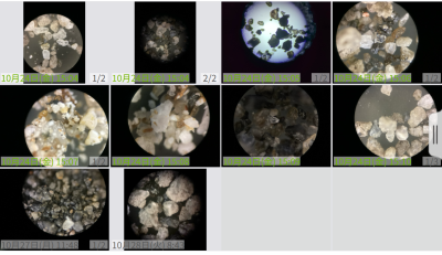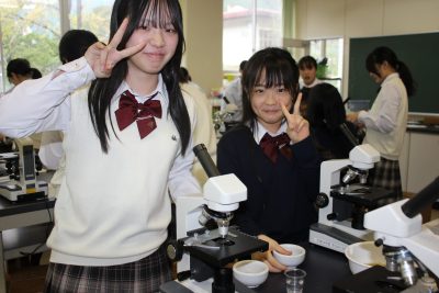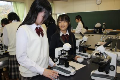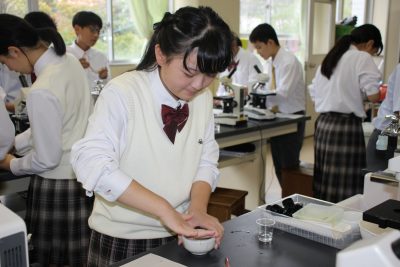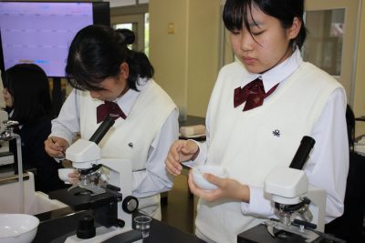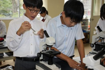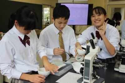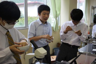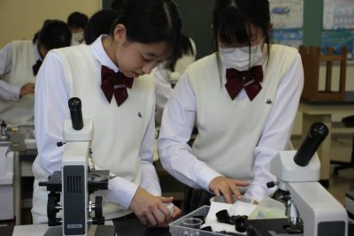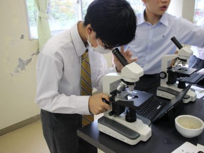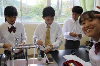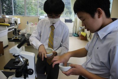 中学1年生は「火山」について学んでいます。火山噴出物としては火山ガス、火山弾、火山灰などありますが、今回は火山灰の顕微鏡観察をしました。まずは火山灰を少量の水で練って、汚れを落とします。顕微鏡で観察すると角ばった鉱物が見えます。なんと、この実験、光を消した方がきれいに見えるんです。光源ランプのスイッチを切ると、「おおっ!」「すげー!」「きれ~!」と歓声が上がっていました。そのきれいな生徒たちの観察画像をぜひご覧ください。