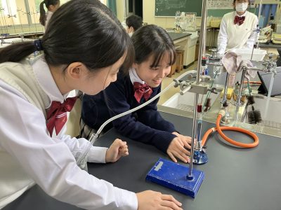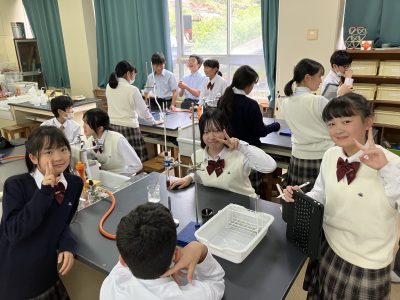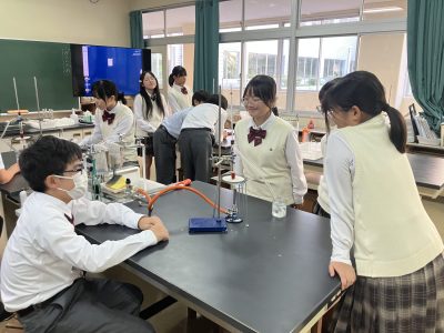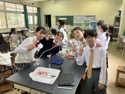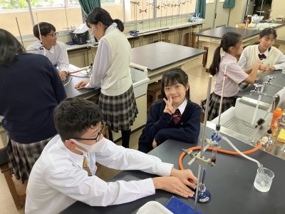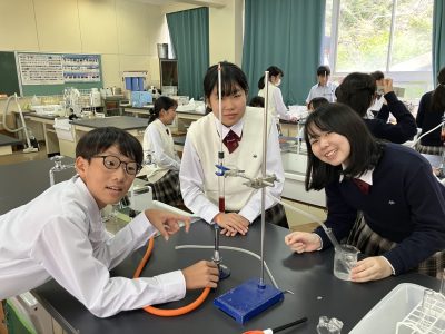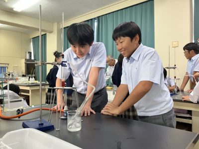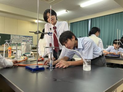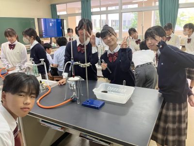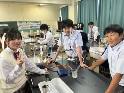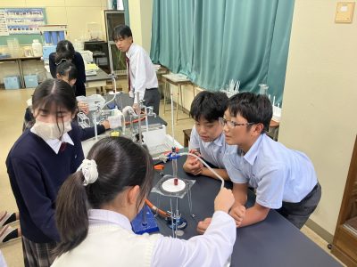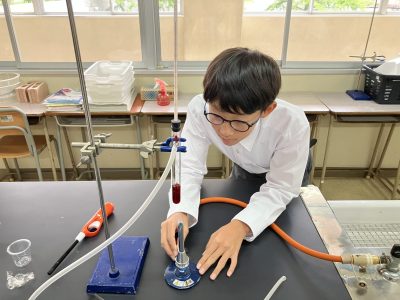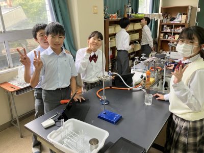 実は,この分野の試験範囲は終えているのですが,実験大好き1年生のために,少し大掛かりな「蒸留」を行いました。大掛かりなだけあってトラブル続出。それでも班のみんなで力を合わせて,慎重にゆっくりと一瞬も目を離すことなく進めて,多くの班が成功しました。生徒たちの感想には,「実験はうまくいかないこともあり,ノートに書いたりして勉強するだけでなく,実際に実験してみることが大切だと思った。」「蒸留を覚えるだけでなく,できるようになってうれしい。」とあり,実験最高!と改めて感じることができました。