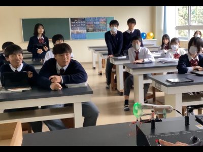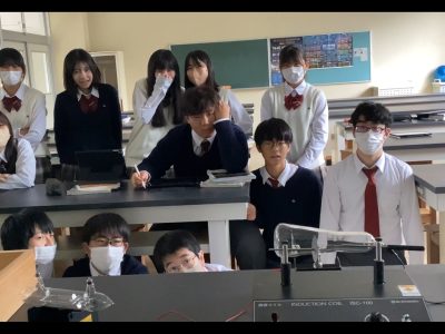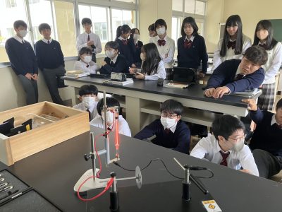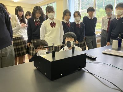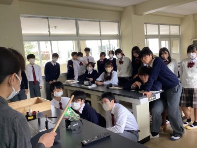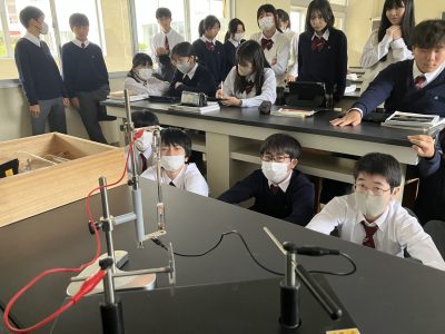 中学2年生では,電流の正体について学習しています。ふつう,空気中を電流が流れたりはしません。しかし,高電圧を加えたり,真空に近い状態にすると電気は流れるようになります。尚学館では,その両方の放電が見られるのです。誘導コイルで気体放電,クルックス管・ネオン管で真空放電を観察しました。教科書では感じることのできない,ビリビリバリバリと空気を切り裂くような轟音と,不思議なにおいも経験できました。ヘリウム,ネオン,アルゴンなどの放電管では気体特有の美しい色の光に歓声が上がりました。