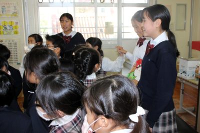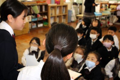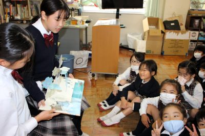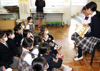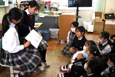 中学1年生が過ごしている西館には尚学館小学校の教室もあります。校時は少しずれていますが、お昼休みはほぼ同じです。せっかくですから中学1年生が小学1・2年生向けに絵本を読む活動を始めました。中学1年生は小さいころにきっとたくさんの絵本を読んでもらったのでしょう、聞いてみるとたくさんの絵本を知っていました。「読みたい人(読みに行ってもいい人)」を募り、毎週金曜日に1冊か2冊を読んでいます。小学生は結構自由にリアクションしながら聞いてくれます。何か読んでもらって嬉しかったという記憶が残るといいです。読み手を務めた生徒は“人の役に立つ”ことを実感できたのではないでしょうか。小学生が毎週金曜日を楽しみにしてくていれば嬉しいですね。