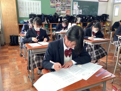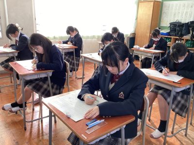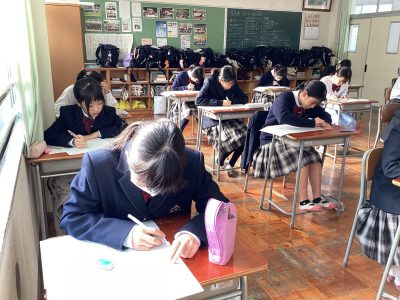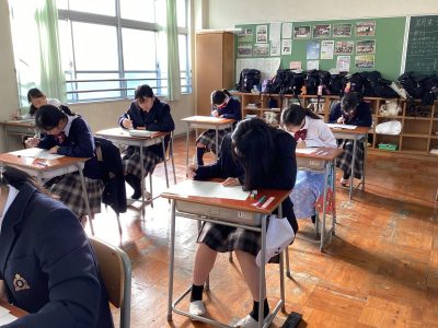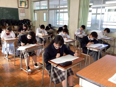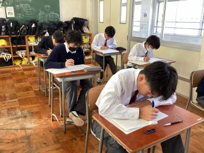 12/2~12/5の4日間、2学期の期末テストが行われました。国数英理社に加えて、音楽、美術、技術家庭、体育などなど多い学年は14種類のテストです。みんな日頃の積み重ねを発揮できたことでしょう。早いものでもう12月です。12/23の終業式、そして冬季課外が終われば冬休みです。写真は中学1年生です。