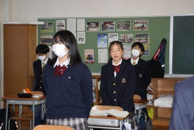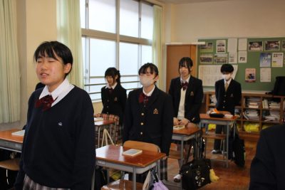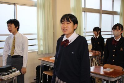 中学1年生は入学時から毎日朝の会でこれを唱和しています。古めかしい行いかもしれませんが、朝から美しい言葉を発すると前向きな気持ちになれるものです。初めは覚えきれず、教室の掲示も達筆すぎて読めませんでしたが、今では目をつぶってでも唱和できます。(今回は特別に目をつぶって唱和してもらいました)