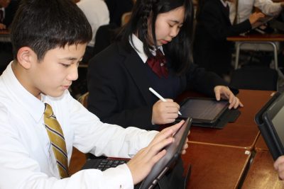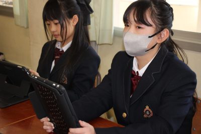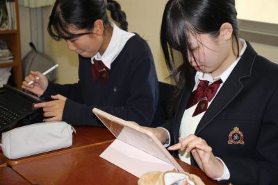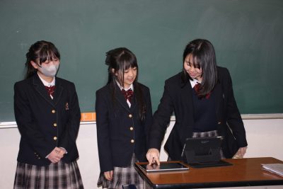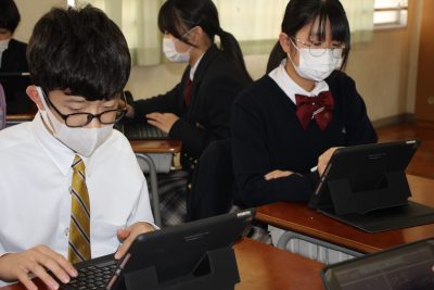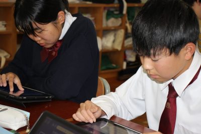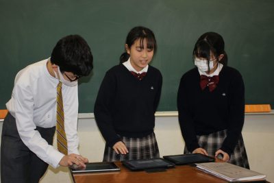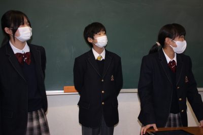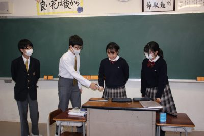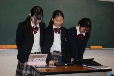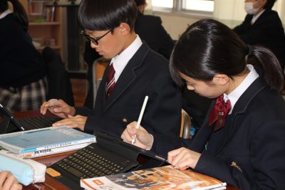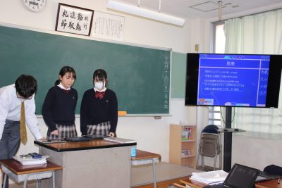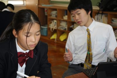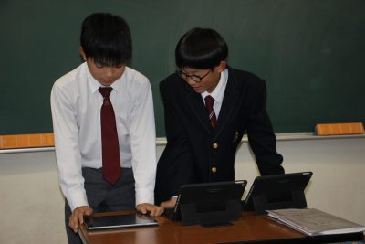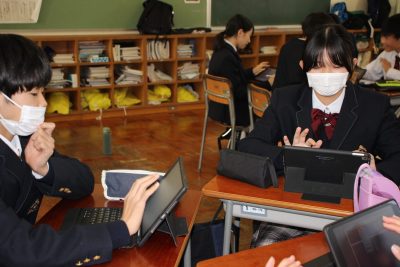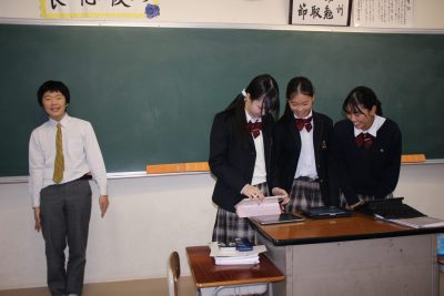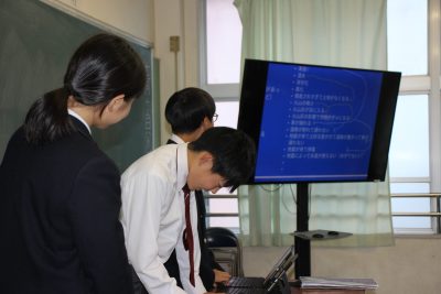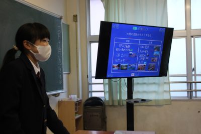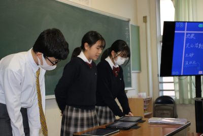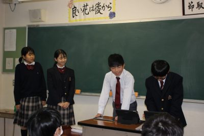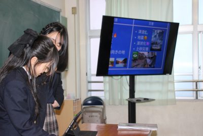 中学1年生は地学分野について学びました。地震や地層、化石についてなどです。そして最後の授業は「大地の活動がもたらす恩恵と災害」についてでした。班を作り、意見を出し合い発表してもらいました。ネット検索しないというルールで行いました。