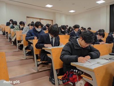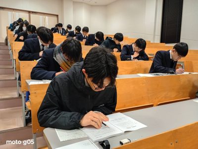 生徒たちは、階段教室や長机など、違う環境に身を置き、本番さながらの緊張感で模試問題に挑みました。会場の下見を兼ねたこの経験で、試験に向けての士気が一層高まったようです。