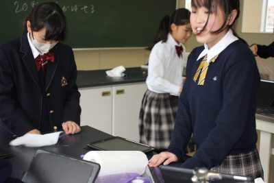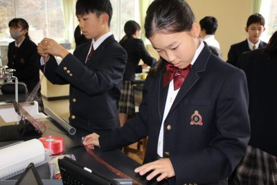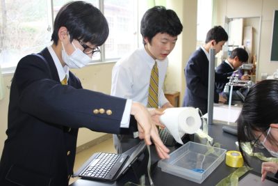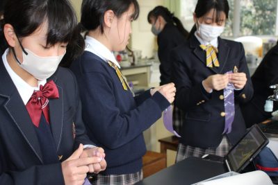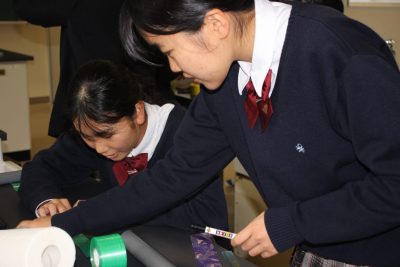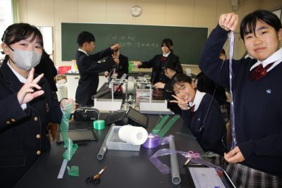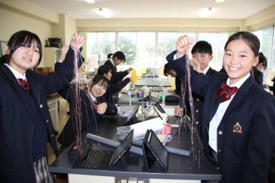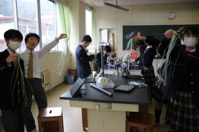 本年度の冬季課外はたった4日。中学1年の理科Ⅱは1時間しかありませんでした。そんな貴重な1時間を静電気を利用した「電気クラゲを飛ばそう」実験にあてたところ、前日が雨だったせいか、なんとあんまりうまくいきませんでした。残念。クラゲの神様である私も苦戦したのでよほど条件が悪かったのでしょう。来年リベンジします。クラゲ作成中の笑顔をご覧ください。