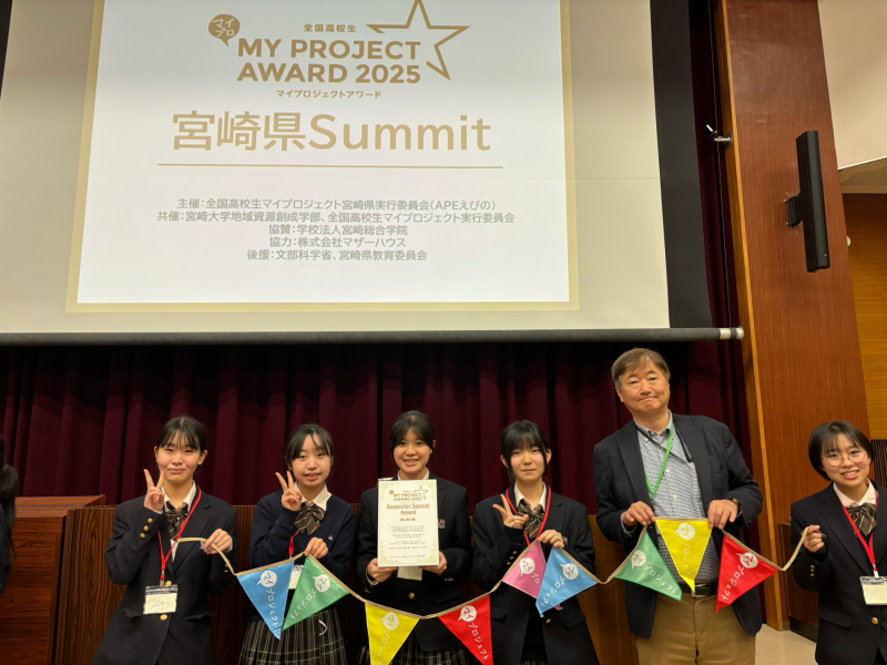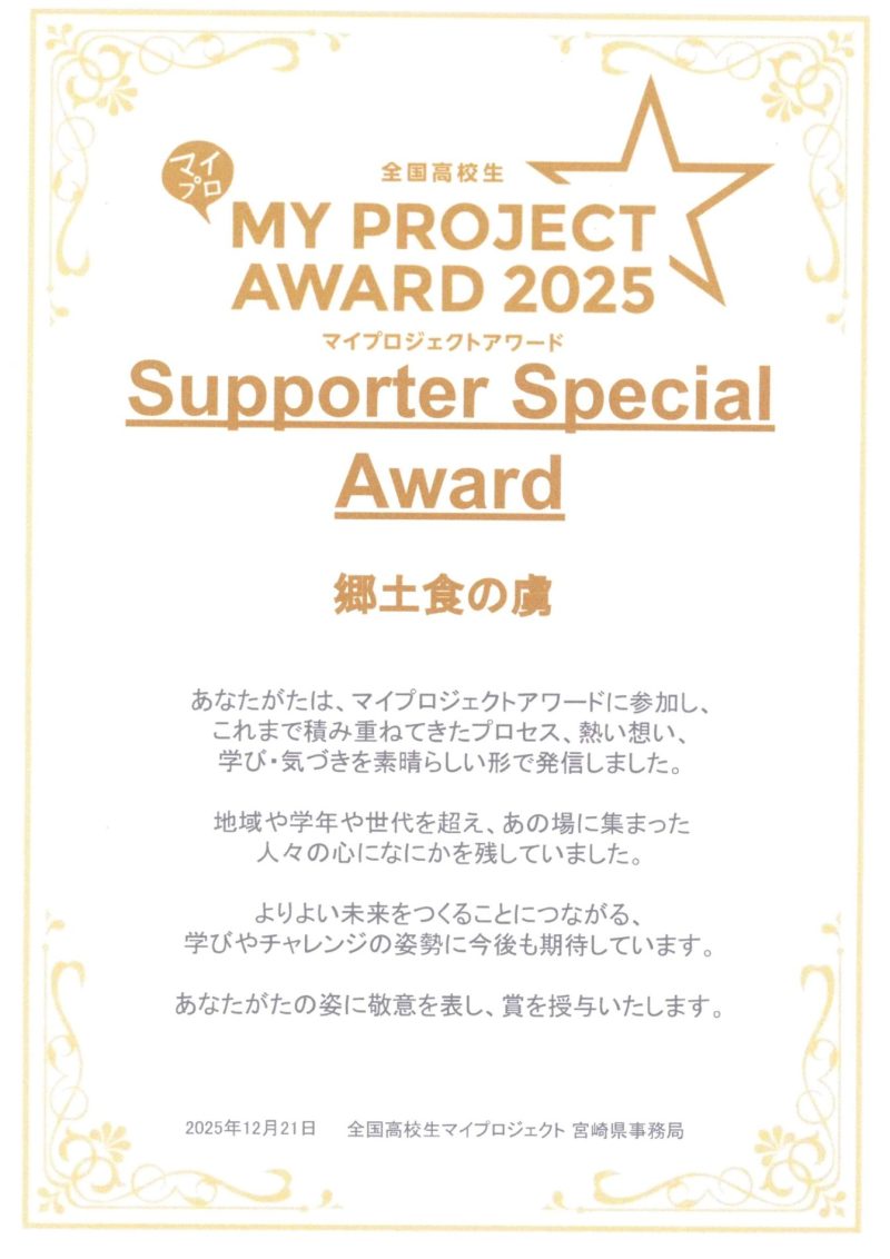 12月21日に宮崎大学で「全国高校生マイプロジェクトアワード2025」宮崎summitが開催されました。本校からは、地域の食文化について探究している小田口未侑さん、河野麻桜さん、福島彩乃さん、村上和香さん、黒田弥生奈さんのチームが参加しました。伝統食を広げる活動についての発表は、サポーター特別賞を受賞しました。受賞のコメントです。