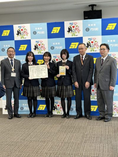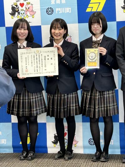 12月26日、本校の生徒3名(請関真歩さん、帯谷到子さん、森山文結さん)が門川町長を表敬訪問しました。3人は、鳥取県で行われた短歌大会で優勝したことを町長に報告しました。