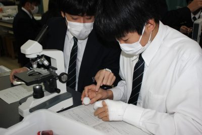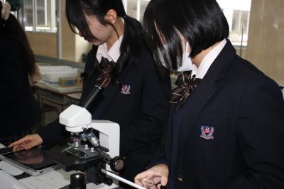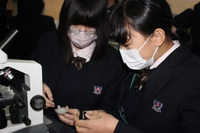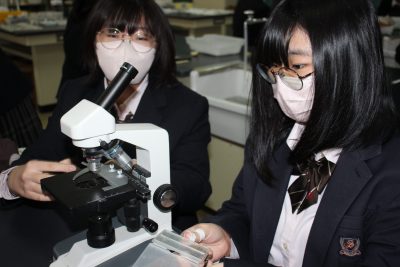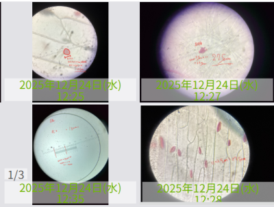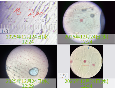 4年生は顕微鏡下で長さを測定するための「ミクロメーター」の使い方を学びました。接眼ミクロメーターと対物ミクロメーターを顕微鏡にセットして、今回は染色したタマネギの核の大きさを測定しました。生徒の実際の観察画像を載せていますので、ぜひご覧ください。
