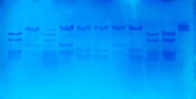 3時間もかかったこの実験、いよいよ結果を確認します。ゲルをDNAを染色する溶液に浸し、脱色するとDNAのバンドが見られます。今年は制限酵素ごとのきれいなバンドパターンが確認できて、大成功でした。よかった。