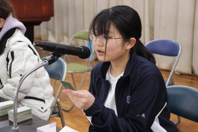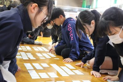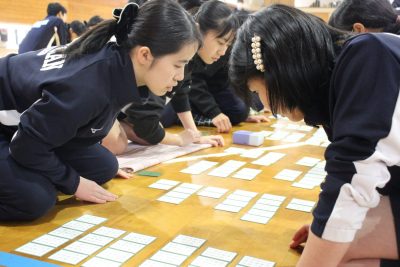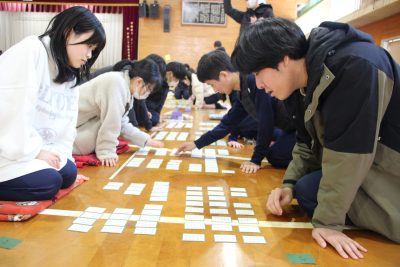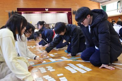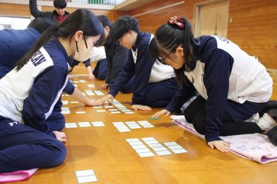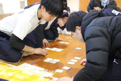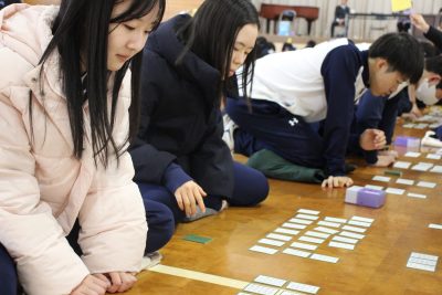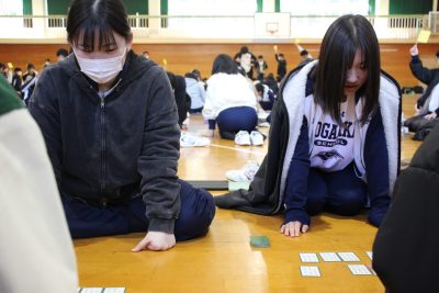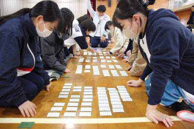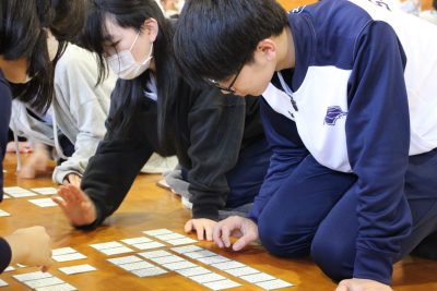 読み手は百人一首部の治久丸君と高須さんと金丸さんか務めました。有名な句が出ると盛り上がり、静かだった会場がにぎやかになりました。また終盤では競っている対戦のところにみんなが集まり、勝負の行方を見守る場面もありました。