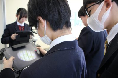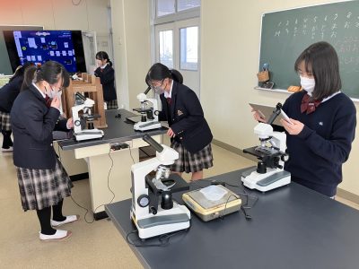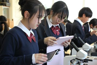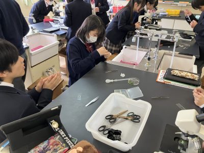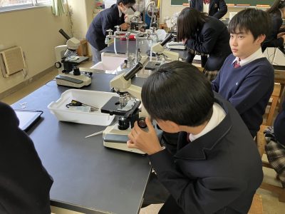 理科Ⅱは生物分野に入りました。私の専門分野です。これからは怒涛の顕微鏡観察の連続です。今回はオオカナダモの細胞を観察しました。最高倍率600倍で葉緑体の姿まで見えました。生徒たちの美しい観察画像をぜひご覧ください。運のよい生徒は葉緑体が流れ動く「細胞質流動」まで見られました。その仕組みは高校で説明するからね。