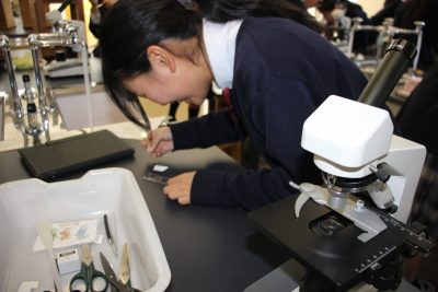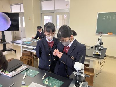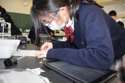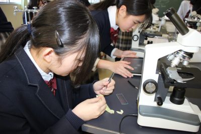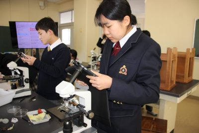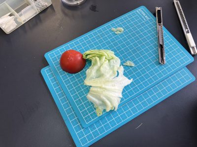 目の前にはフレッシュなトマトとレタス。お腹がすいた4時間目、「レタス食べたぁ~い」という生徒をほったらかして休み時間にトマトをカットしました。今回はこのトマトとレタスを観察をしました。なんと私これらを見るのは初めてで、生徒たちと一緒に方法を探りながら観察しました。もう顕微鏡観察も5回目になるので、生徒たちはとても上手です。(観察画像をぜひご覧ください)