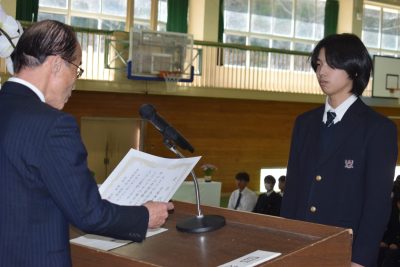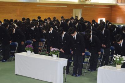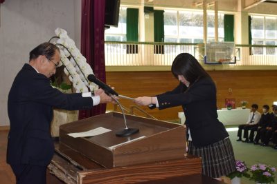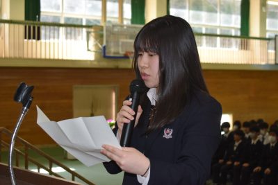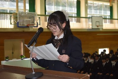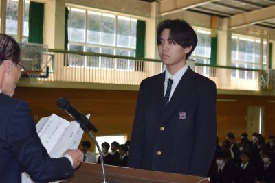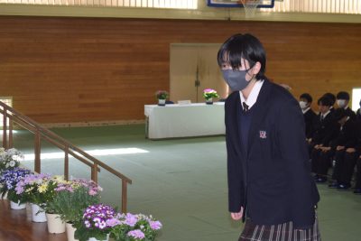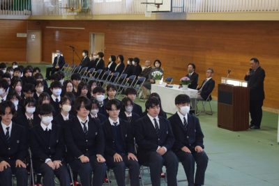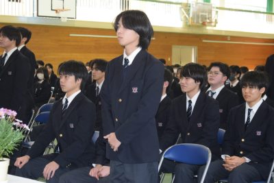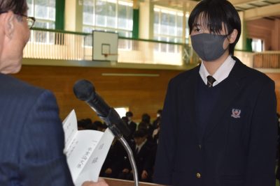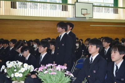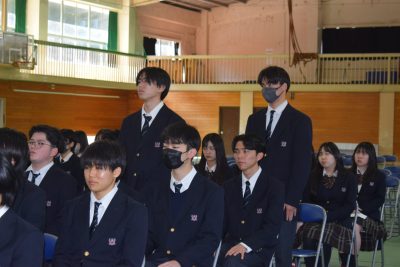 2/28に30期生の表彰式並びに記念品贈呈受領式、同窓会入会式が行われました。同窓会入会式では入会者代表の藤原妃花さんが宣誓をし、同窓会副会長の末永陽一さんがお話をしてくださいました。表彰式では皆勤者の発表があり、代表で安藤颯真君が賞状を受け取りました。記念品贈呈受領式では卒業記念品の贈呈を長谷川理子さんが、卒業論文集の贈呈を池澤帆胡さんが、卒業記念品の贈呈は花岡廉虎君が務めました。