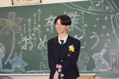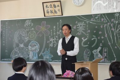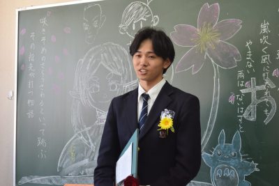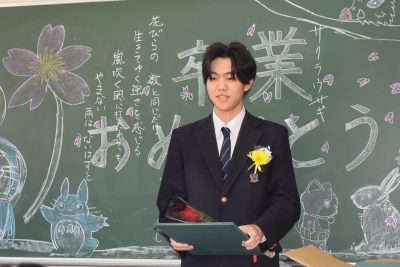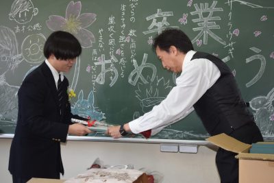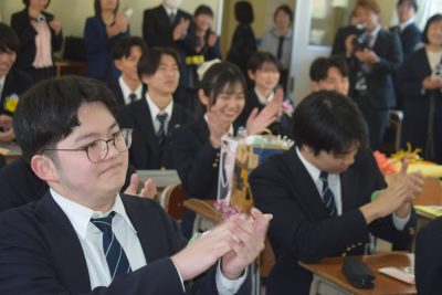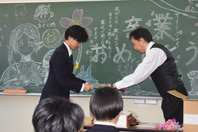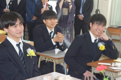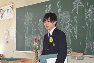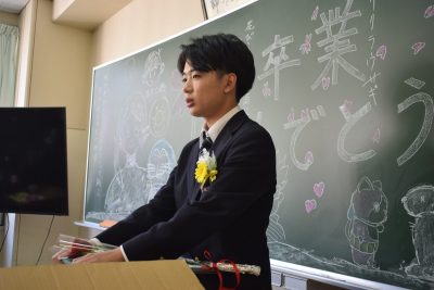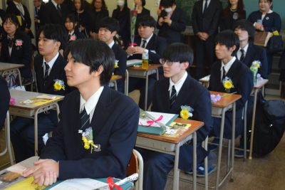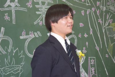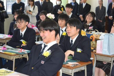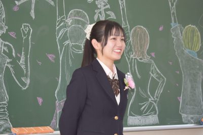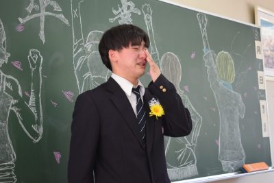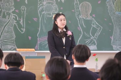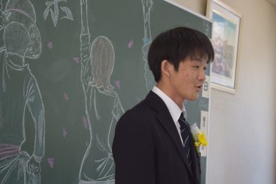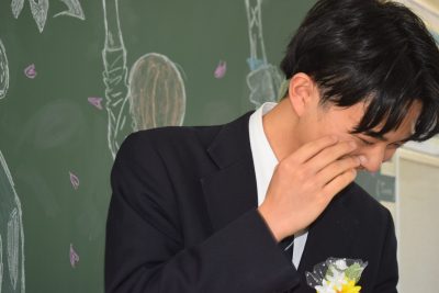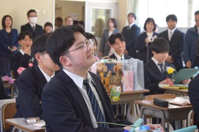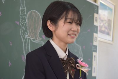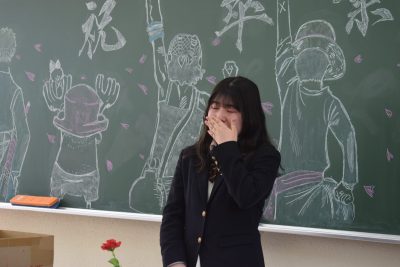 卒業式後、教室では最後のHRが行われました。保護者様が見守る中、一人ずつ友達や親、先生に対して感謝を述べました。「お母さん、尚学館に来させてくれて、ありがとう」「途中から入った私を受け入れてくれてありがとう」「いつもお弁当を作ってくれてありがとう」「みんな、楽しい思い出をありがとう」と感謝の言葉が尽きぬようでした。